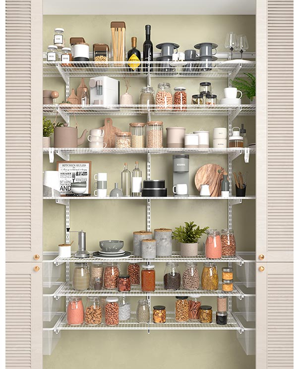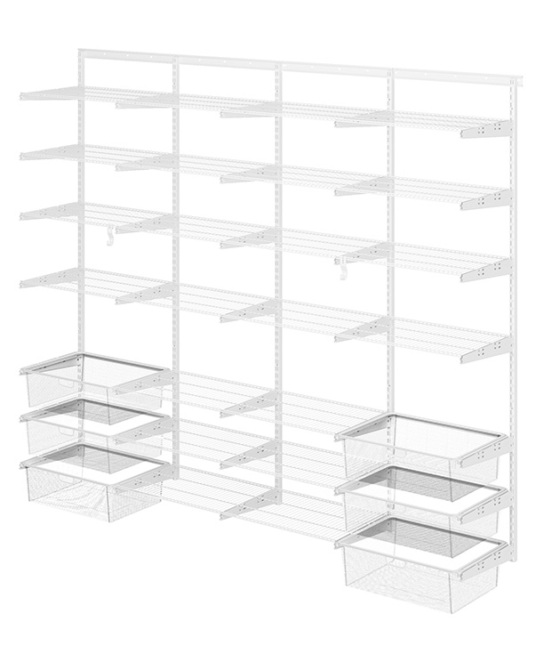 В комплект входят несущие рельсы и навесные направляющие, полки, штанги, аксессуары, крепежные элементы. Можно докупить множество дополнительных компонентов для гардеробной системы.