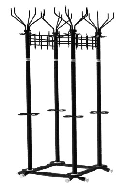 Удобная и вместительная вешалка позволяет компактно разместить большое количество одежды на четырех пятирожковых головах и четырех решетках, вертикальные штыри которых предназначены для подвешивания как одежды, так и сумок.