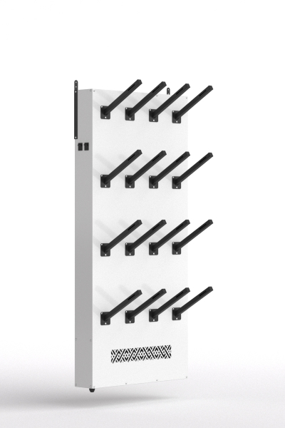 Cушильное устройство предназначено для просушки 8 пар обуви и перчаток.Данные сушилки используются внутри помещений на предприятиях пищевой, нефтегазовой и других отраслях промышленности и животноводства. Так же находят применение в строительных, транспортных, судоходных компаниях, образовательных учреждениях. Встроенная УФ-лампа позволяет устранить неприятные запахи, оказывает дезинфицирующее действие. Сборка происходит путем прикручивания винтами воздуховодов и ножек к сушильному модулю. Подключается к бытовой розетке.