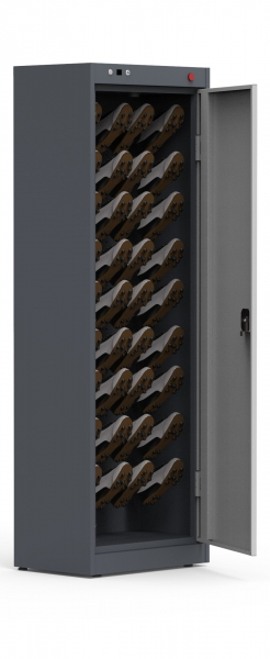 Шкаф предназначен для быстрой и эффективной сушки 18 пар бутс / перчаток. Шкаф оснащён нагревательными элементами и вентиляторами, которые обеспечивают циркуляцию тёплого воздуха внутри камеры. Это позволяет быстро и равномерно высушить мокрое снаряжение, предотвращая его порчу, Встроенная УФ-лампа позволяет устранить неприятные запахи