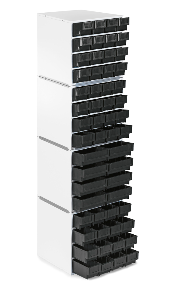 Это универсальная модульная система хранения, которая легко подстраивается под нужды, специфику и объемы предприятия или склада. За счет небольших габаритов и возможности вертикального размещения тумб-сегментов позволяет занимать минимум места, при этом, позволяя хранить большое количество деталей, комплектующих, готовых узлов или запчастей, а также размещать небольшие инструменты.