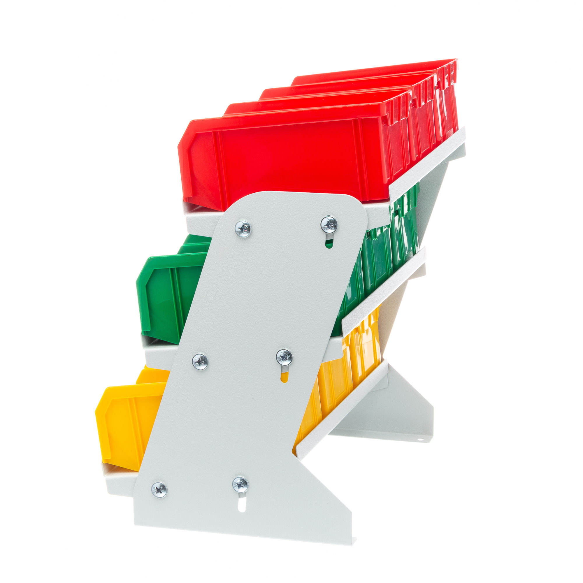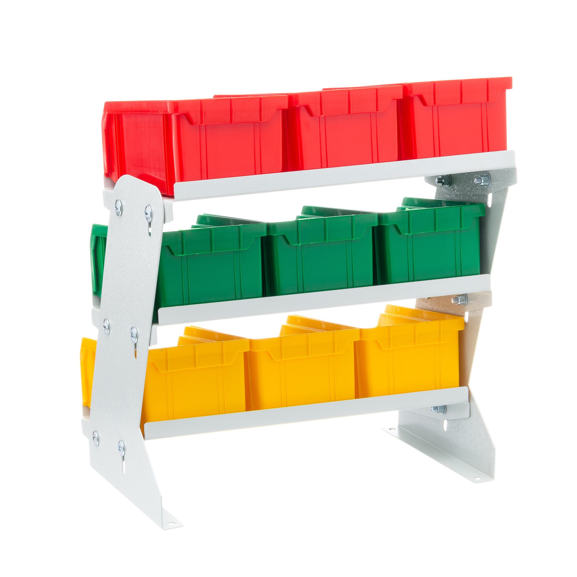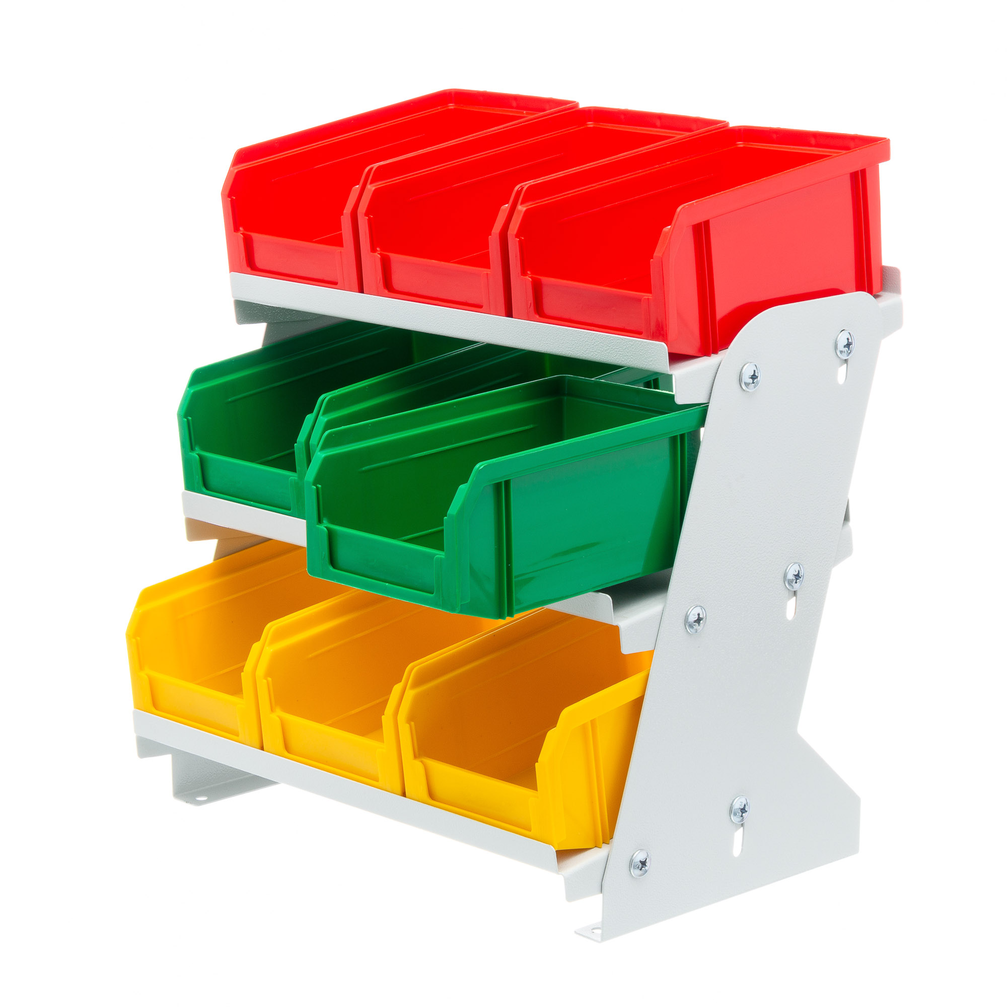 Настольный органайзер с ящиками V-1, 9 ящиков, для хранения мелких изделий. Настольные органайзеры с ящиками V-1 являются отличным дополнением к рабочему месту, где необходим быстрый доступ к мелкоштучным изделиям. Они могут устанавливаться на вашем рабочем столе, тумбе, верстаке, стеллаже, торговой витрине, применяться в автосервисе и т.п. Металлическая конструкция органайзера способна выдержать ящики, полностью нагруженные металлом. Предусмотрена возможность наклона полок для большего удобства работы. В комплект входит: пластиковый ящик V-1 9 шт., настольный органайзер без ящиков V-1. Пять основных цветов ящиков: желтый, зеленый, красный, серый, синий помогут оживить ваше рабочее место, вписаться в корпоративные цвета вашей компании или просто грамотно рассортировать, хранящиеся в ящиках, изделия. При необходимости, ящики легко устанавливаются и снимаются с органайзера. Технические характеристики: тип ящиков V-1, высота 360мм., ширина 215мм., длина 320мм. Общий вес 3,6 кг. Общий объем 0,02куб.м. Габариты упаковки органайзера 330х200х100мм. Габариты упаковки с ящиками: 300х170х210мм. Размер ящика V-1 172х102x75мм., объем 1л. Температура эксплуатации от -20 до +70С.