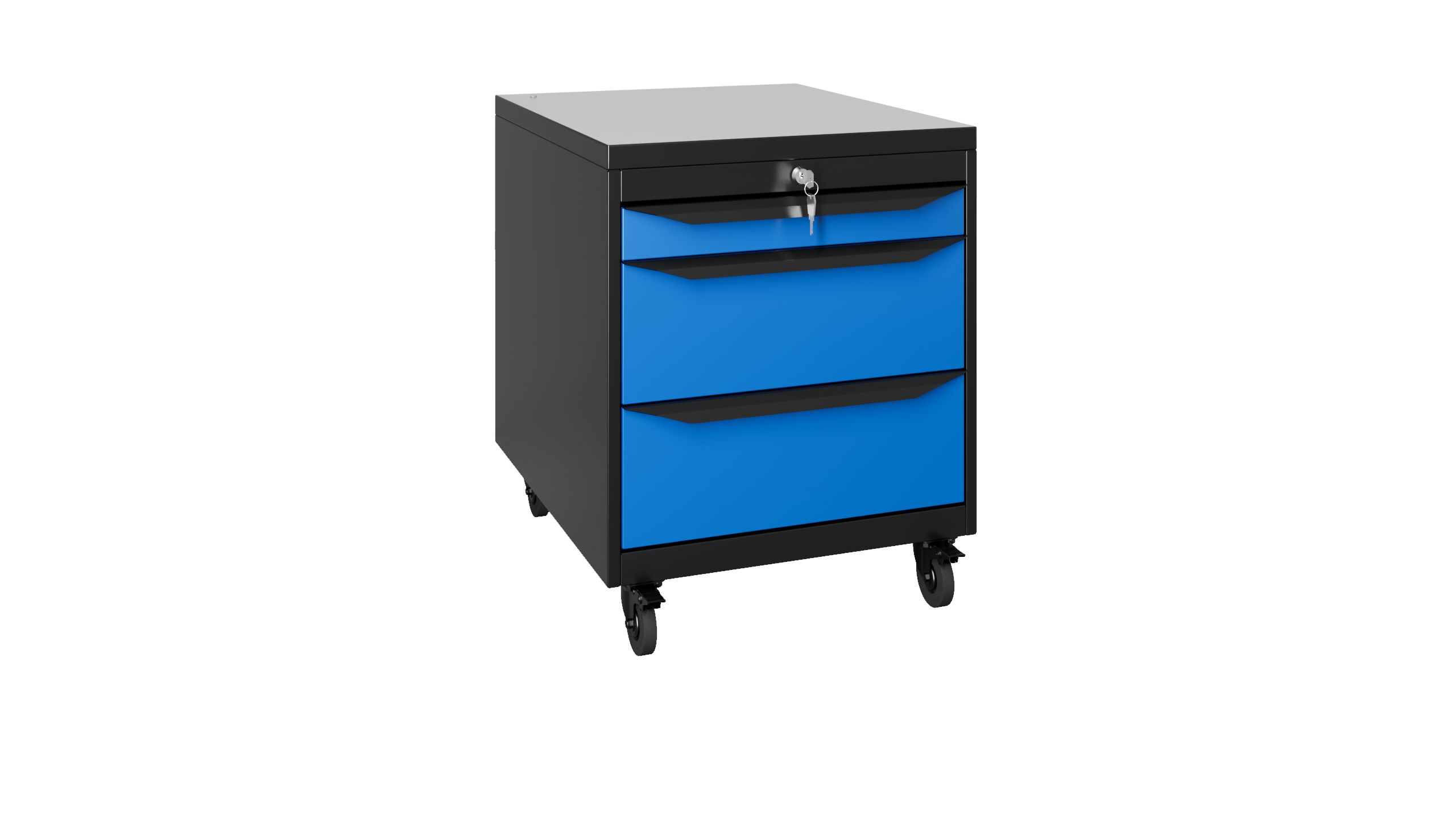 Окраска элементов корпуса осуществляется порошковой антистатической краской: RAL 9011 (темный графит), дверцы RAL 5023 (синий), столешница RAL 7047 (серый).