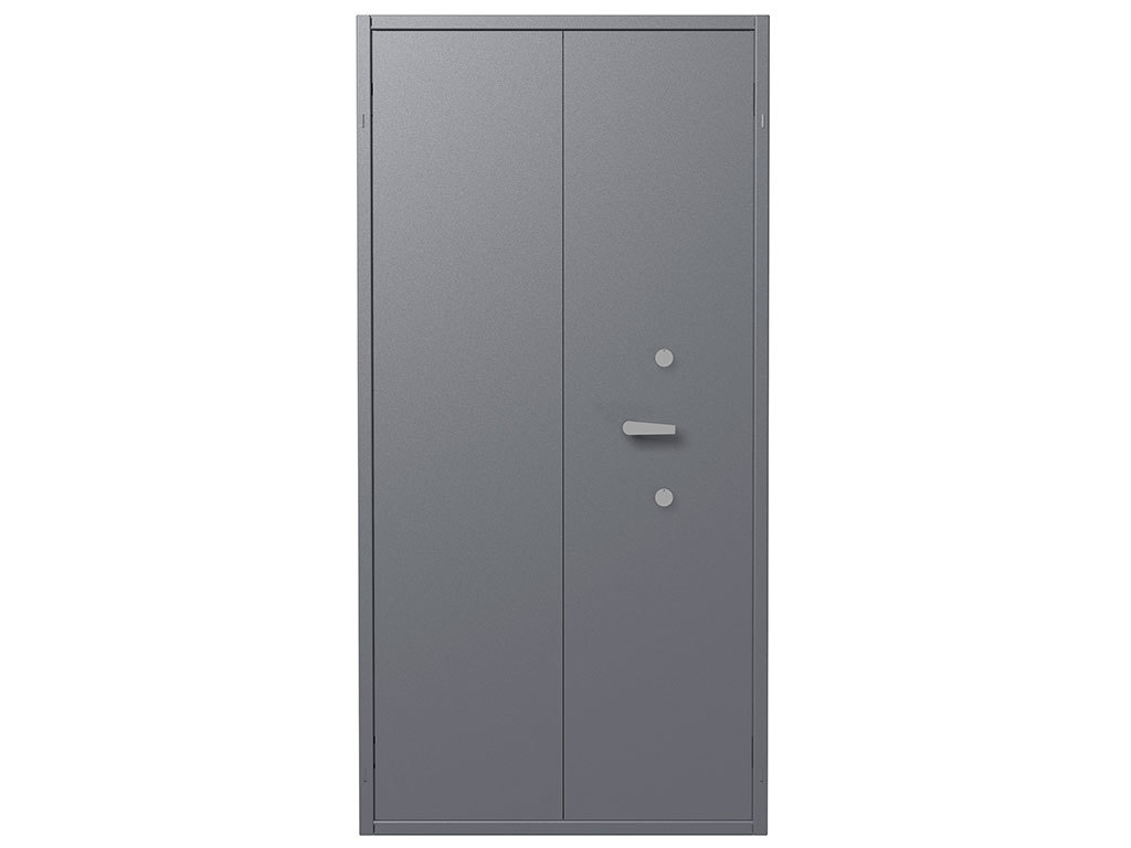 Комплектуются двумя ключевыми сувальдными замками класс 2 ГОСТ 5089-2011 (по 2 ключа от каждого замка в комплекте) с опечатывающими устройствами. Поворотная ручка для удобства открывания и закрывания. Левая створка двери оборудована двумя подпружиненными самозапирающимися защелками (вверх и вниз) с приводом от ручки находящейся на внутренней стороне створки двери