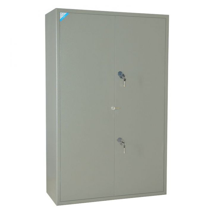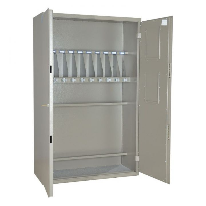 Сейф двухсекционный, на 10 стволов, оборудован 3-мя полками под прицелы и 10-ю отсеками для магазинов.