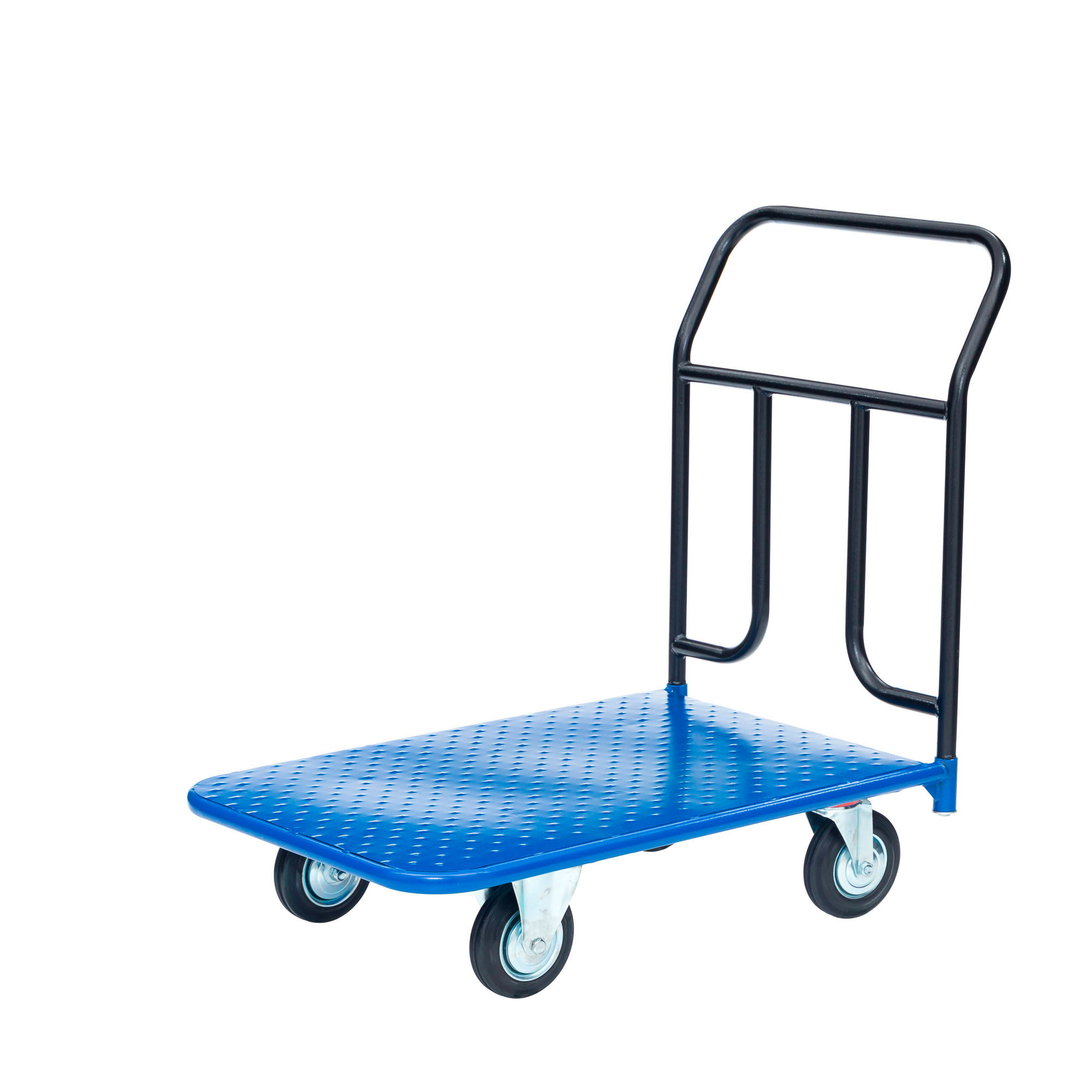 Платформенная 4-х колесная тележка КП-300 (600х900) используется для перемещения различных грузов в складских помещениях. Ручка крепится к платформе болтами, для компактного хранения можно снять, высота ручки 750мм. Платформа имеет уникальную рельефную, полимерную, противоскользящую поверхность. Цвет синий, шагрень. Для легкого перемещения тележка КП-300 комплектуется 2 поворотными и 2 неповоротными колесами, изготовленными из высококачественной литой резины.