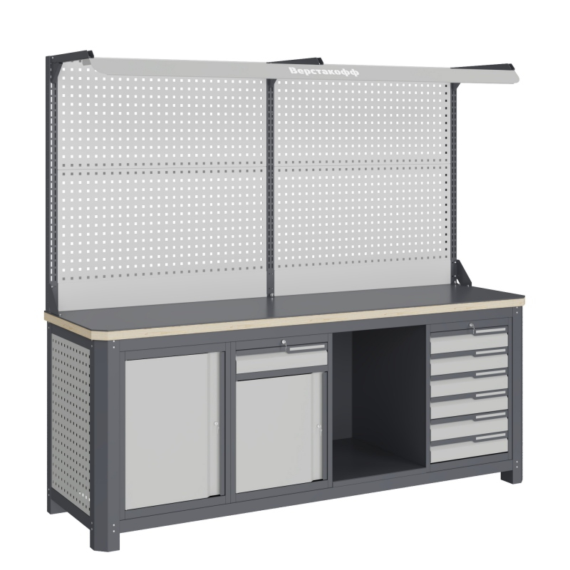 Экран (перфорированная панель) верстака выполнен с квадратной перфорацией 12х12 мм с шагом 38 мм для установки крючков, держателей и других аксессуаров. Экран крепятся к столешнице с помощью специальных кронштейнов. Максимальная масса груза, равномерно распределенного по поверхности экрана, составляет 71 кг.