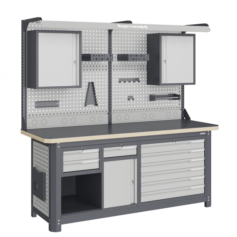Рабочее место серии MECHANIC: MCN 2052.S28L6.2-2FR состоит из столешницы шириной 1993 мм, рамы верстака, состоящей из опор, перемычек, боковых перфопанелей, одного малого подвесного модуля S2, одного малого модуля S8, одного большого модуля L6, двойного экрана с кронштейнами, комплекта освещения и блока коммуникаций, двух навесных шкафов, двух лотков №1, одного держателя ключей, одного держателя отвёрток, одного держателя рулона, одной вешалки №1, одной вешалки №2, одного кармана для документации.