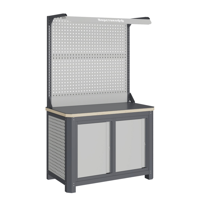 Экран (перфорированная панель) верстака выполнен с квадратной перфорацией 12х12 мм с шагом 38 мм для установки крючков, держателей и других аксессуаров. Экран крепится к столешнице с помощью специальных кронштейнов. Максимальная масса груза, равномерно распределенного по поверхности экрана, составляет 71 кг.