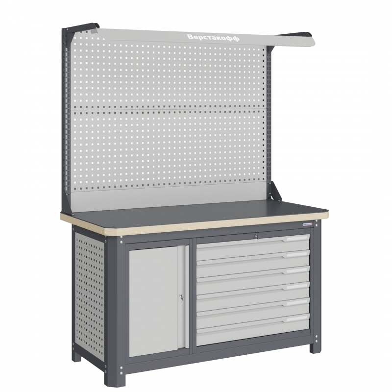 Верстак серии MECHANIC: MCN 1552.S7L6-2F состоит из столешницы шириной 1493 мм, рамы верстака, состоящей из опор, перемычек, боковых перфопанелей, малого модуля S7, большого модуля L6, двойного экрана с кронштейнами и комплекта освещения.