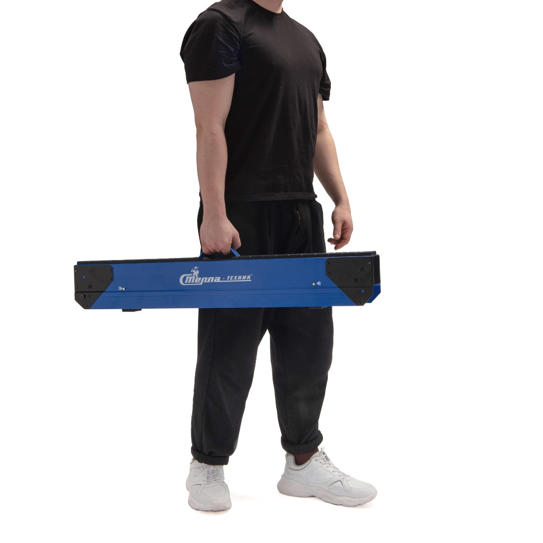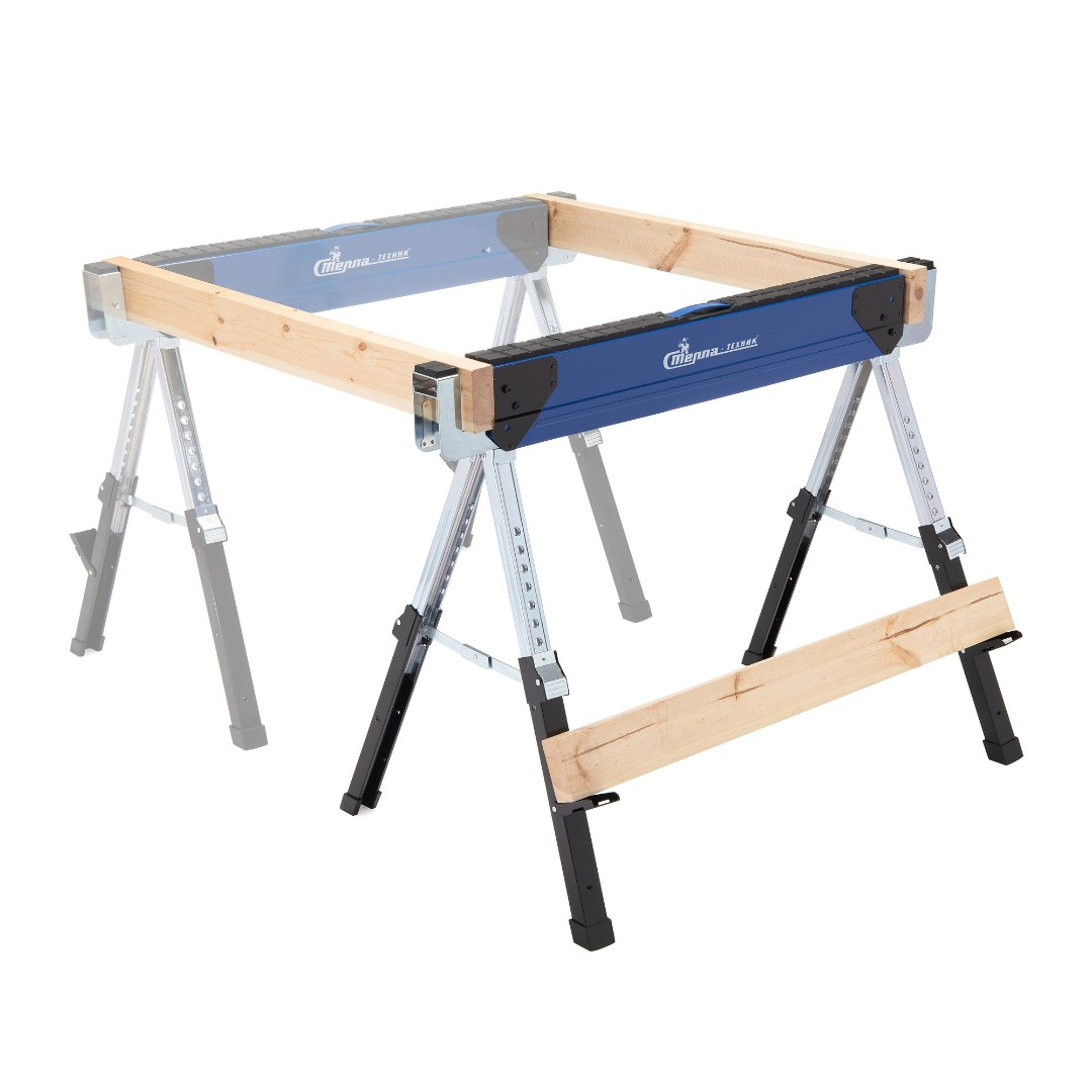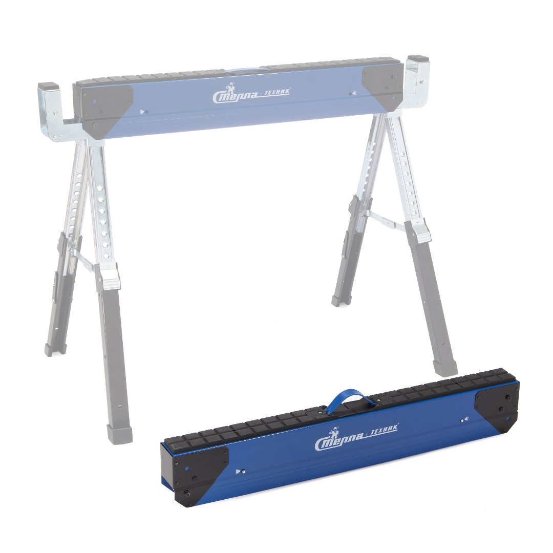 Складные козлы имеют 2 ложемента для распила длинномерного бруса или для установки связывающих брусьев размером 47x100мм, что позволяет увеличить рабочую поверхность и обеспечивает жесткость конструкции рабочего места. Также включает в себя новаторские опоры для временного хранения и поддержки листового материала, которые дают возможность вертикальной фиксации и простого и быстрого раскроя листовых материалов.