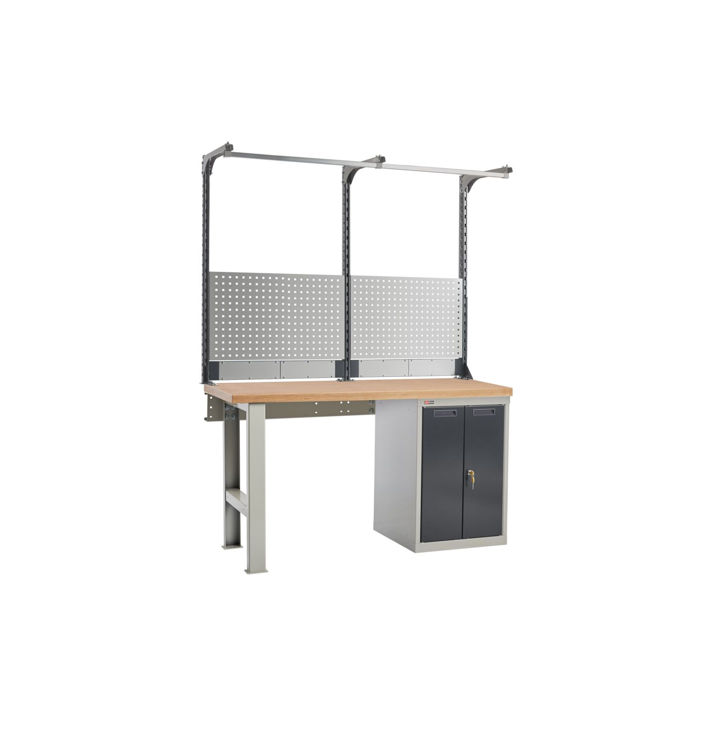 Металлические элементы верстаков окрашены эпоксидной порошковой краской, устойчивой к механическим воздействиям и агрессивным жидкостям. Ящики, дверцы тумб и стойки экрана – цвет антрацитово-серый RAL 7016, остальные элементы – цвет серый RAL 7038.