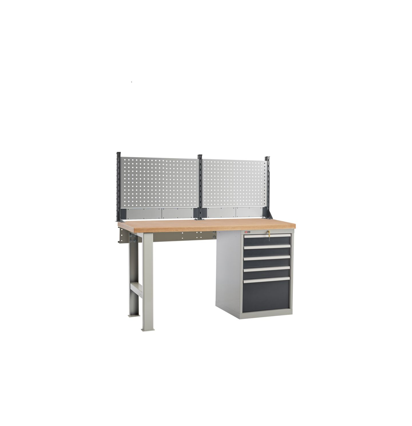 Металлические элементы верстаков окрашены эпоксидной порошковой краской, устойчивой к механическим воздействиям и агрессивным жидкостям. Ящики, дверцы тумб и стойки экрана – цвет антрацитово-серый RAL 7016, остальные элементы – цвет серый RAL 7038.